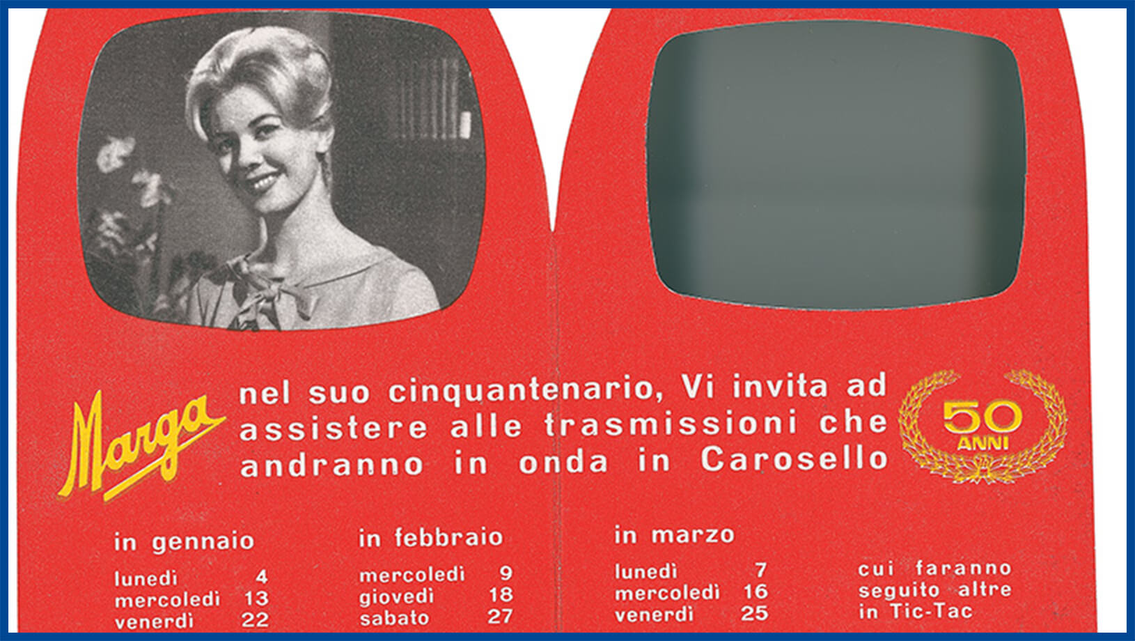 Va in onda il primo Carosello (pubblicità della durata di 15 minuti) Sutter per i lucidi da scarpe MARGA, intitolato “Oggi è di moda…”.